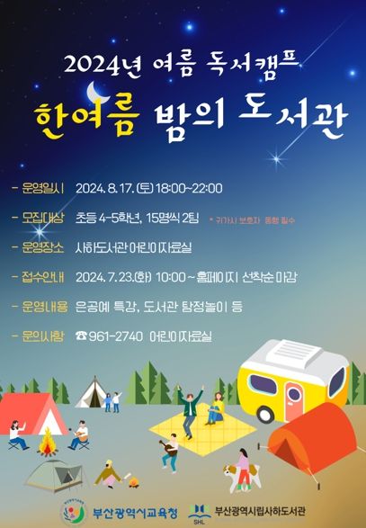 (아름다운교육신문) 부산광역시교육청사하도서관은 오는 8월 17일 오후 6시부터 10시까지 사하도서관 어린이실에서 관내 초등학교 4, 5학년 30명을 대상으로 독서캠프 ‘한여름 밤의 도서관’을 운영한다.
