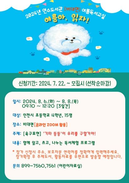 참여 신청은 연수도서관 홈페이지에서 가능하며 7월 22일부터 선착순 모집한다. 자세한 사항은 연수도서관 어린이자료실로 문의하면 된다