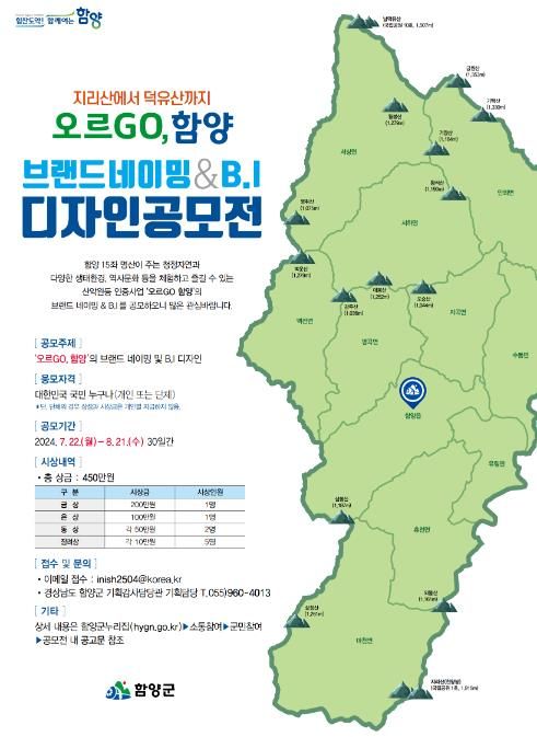 국민 누구나 참여할 수 있는 이번 공모전은 ‘오르GO, 함양’의 브랜드 네이밍과 이미지(BI·브랜드 아이덴티티) 및 응용 디자인 등을 공모하며, 모두 9점을 선정할 예정으로 금상 1점 200만 원, 은상 1점 100만 원, 동상 2점 각 50만 원, 장려상 5점 각 10만 원 등 총상금 450만 원 규모이다.