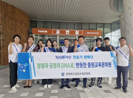 배상근 중원교육문화원장은 “이번 캠페인을 통해 조직 구성원들의 청렴 의식 고취 및 청렴도 제고 방안을 함께 모색하는 계기가 됐다.”며, “앞으로도 지역사회와 연계한 청렴문화 확산을 위하여 다양한 방식으로 청렴을 홍보하여 기관 청렴 이미지를 향상하겠다.”고 말했다.