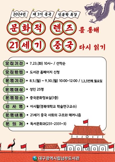 (아름다운교육신문) 대구남부도서관은 8월 5일부터 9월 30일까지 ‘제3기 중국 인문학 프로그램’을 운영한다.