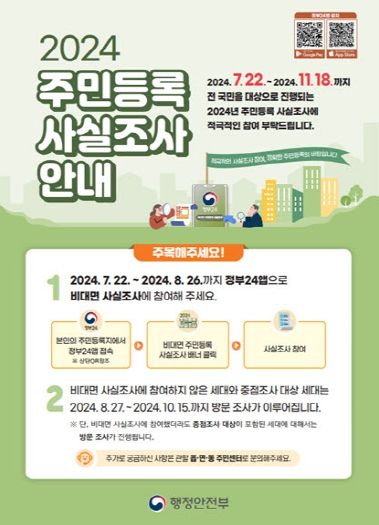 주민등록 사실조사는 주민의 실거주지와 주민등록상 거주지를 일치시키기 위해 진행하는 조사로 7월 22일부터 8월 26일까지는 정부24 앱을 통한 비대면-디지털 조사가 진행되고, 8월 27일부터 10월 15일까지는 마을 이장과 담당 공무원의 방문조사로 진행된다.