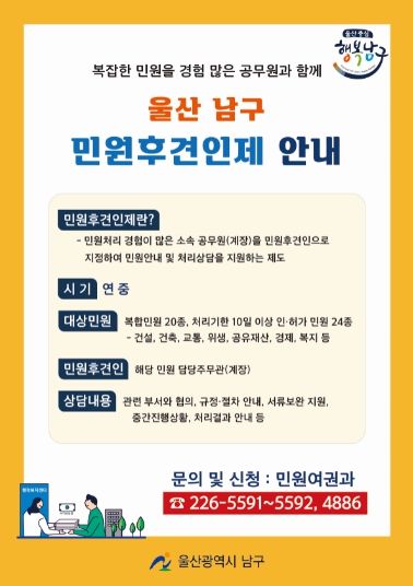 서동욱 울산 남구청장은 “행정 경험이 풍부한 계장급 공무원을 민원후견인으로 지정해 민원처리 만족도가 높아지고 있다.”며, “앞으로도 수요자 중심의 행정서비스로 구민이 체감하는 적극 행정을 펼치겠다.”고 말했다.