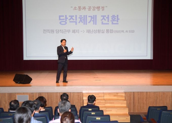 강 시장은 “취임 이후 비효율적 당직근무의 개선을 고민했다. 담당부서 등은 행안부 지침 때문에 어렵다고 했지만, 직원들과 소통 과정에서 새로운 방안을 도출했다”며 “오랜시간 시행됐던 당직제를 재난상황실로 통합하고, 전담인력과 인공지능(AI)이 대신 할 수 있도록 하는 것, 이것이 행정의 변화”라고 말했다.