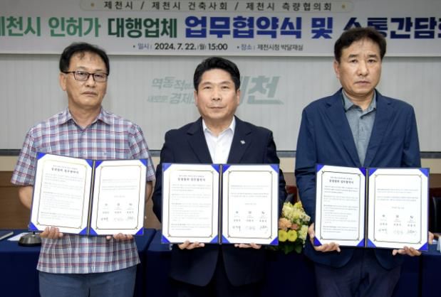 특히 이날 제천시(시장 김창규)와 제천시 지역건축사회(회장 이한식), 제천시 측량협의회(회장 유용석) 삼자 간 업무협약을 체결하고, 상호 협력체계 구축을 통해 신속한 인허가 민원처리 및 서비스 강화에 적극 협력하기로 했다.