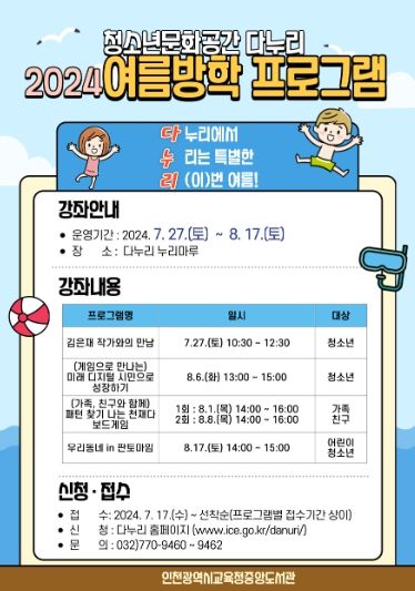 (아름다운교육신문) 인천광역시교육청중앙도서관 청소년문화공간 다누리는 7월 27일부터 8월 17일까지 ‘2024년 여름방학 청소년 프로그램 - 다누리에서 누리는 리(이)번 여름’을 운영한다.