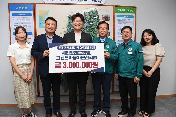 (아름다운교육신문) 시티장례문화원, 그랜드자동차 운전학원이 완주군 저소득층 및 호우피해가정을 위해 성금 300만 원을 전달했다.