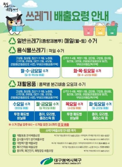 이에 따라 대구 북구청은 주민들에게 배출요령을 적극 알리고자 한 번에 알아보기 쉬운 ‘쓰레기 배출요령’ 책자형 안내서를 제작하여 관내 모든 공동주택 관리사무소와 동 행정복지센터 통장들에게 배포한다. 안내서는 각 쓰레기의 배출 방법, 요일별 배출일 뿐만 아니라 종이팩, 폐건전지 등을 생필품으로 교환하는 사업과 고품질의 재활용 자원인 투명페트병 배출 방법도 안내되어 있다.