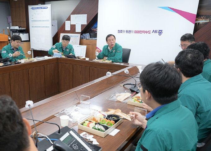 최민호 시장은 23일 시청 상황실에서 김하균 행정부시장, 조수창 시민안전실장, 인종환 재난안전상황팀장을 비롯한 팀원 전원과 도시락으로 오찬을 함께하며 노고를 위로했다.