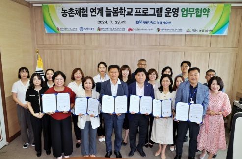 전북교육청과 전북농업기술원은 23일 익산 농업기술원에서 민완성 미래교육과장과 권택 자원경영과장 등이 참석한 가운데 ‘농촌체험 연계 늘봄학교 프로그램 운영을 위한 업무협약’을 체결했다.