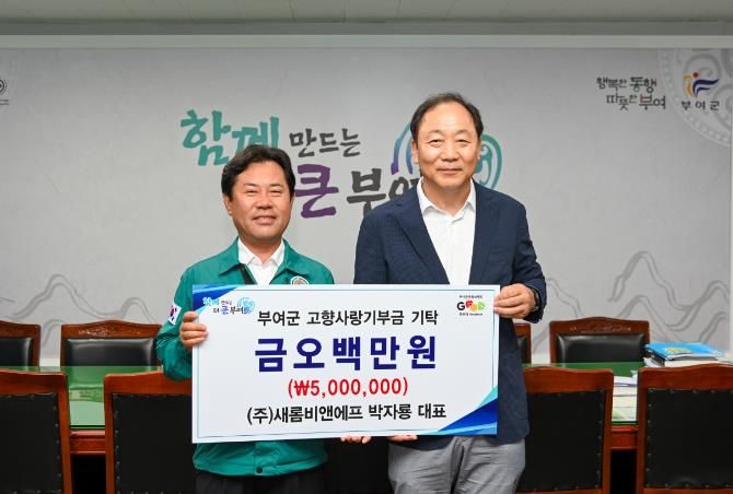 (아름다운교육신문) 지난 23일 ㈜새롬B·F 농업회사법인 박자룡 대표가 고향발전을 위해 부여군에 고향사랑기부금 500만 원을 기탁했다.
