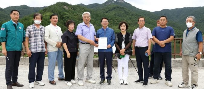 강 군수는 이 자리에서 기존 하천기본계획 대비 홍수량이 26% 증가해 홍수 조절을 위한 댐 건설이 시급하고, 현재 홈골제는 낮은 안전등급과 하천용수공급 기능이 없어 개선이 필요하며, 농업용수 담수로 갈수기 유량 부족 문제가 있어 하천 생태계 기능 유지가 곤란한 점을 강조하며 사업의 필요성을 설명했다.
