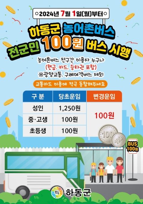 이에 하동군은 2024년 7월부터 관내 농어촌버스를 이용하는 모든 이용객이 100원(카드, 현금, 승차권)만으로 지역 내 어디든 갈 수 있도록 이용 범위를 크게 확대했다.