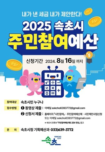 (아름다운교육신문) 속초시는 2025년도 본예산에 반영할 주민참여예산 시민제안사업을 오는 8월 16일까지 공모한다.