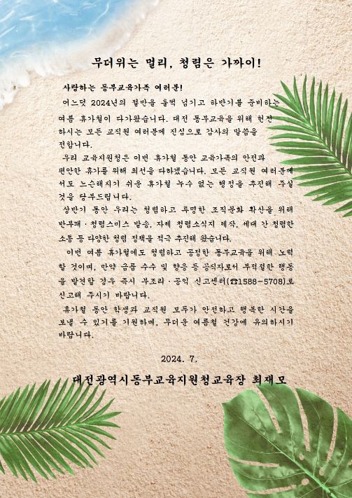 교육장은 청렴서한문을 통해 대전 동부교육을 위해 헌신하는 교직원에게 감사를 표하며, 느슨해지기 쉬운 휴가철 누수 없는 행정을 추진해 줄 것을 당부했다.