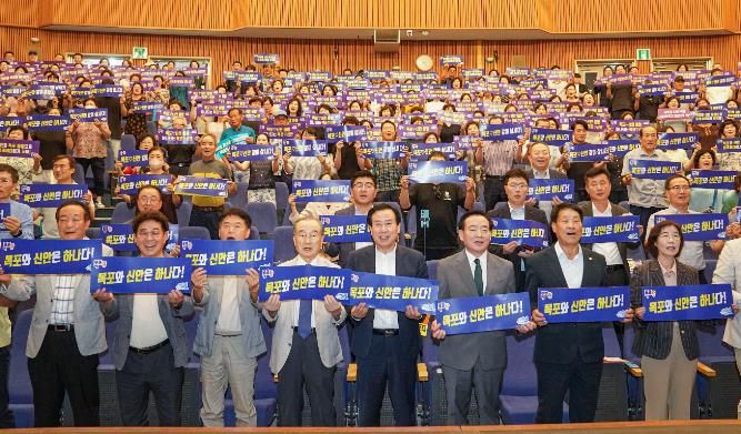 설명회에 앞서 목포시는 목포․신안 통합과 목포대 의대유치 성공 기원 퍼포먼스를 통해 성공적인 목포․신안 통합과 의대유치에 지역민의 결의를 다지는 시간을 가졌다.