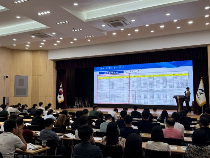 이날 강의는 전문적이고 체계적인 교육을 위해 공공조달역량개발원의 윤경수 주임교수를 강사로 초빙해 △ 원가계산 개념 및 용어 △ 설계내역서 구성 △ 비목의 검토 △ 표준품셈‧일위대가‧단가산출서 검토 방법 △ 적정공사비 산정 사례 등으로 진행됐다.