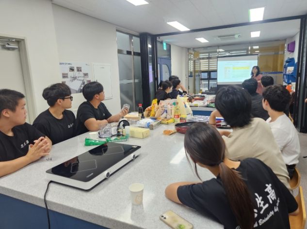 김선우, 김선재, 이현우, 전은빈 학생 4명과 대학생 2명은 ‘농산물 표준규격 미달 과채류를 활용한 식품 개발’을 주제로 조별 활동을 진행하고 있다.