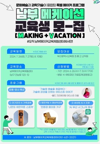 (아름다운교육신문) 부산광역시교육청창의융합교육원은 7월 26일부터 8월 10일까지 남부메이커교육체험센터에서 부산 시내 초·중·고 교사 39명을 대상으로 ‘남부 메케이션 프로그램’를 운영한다.