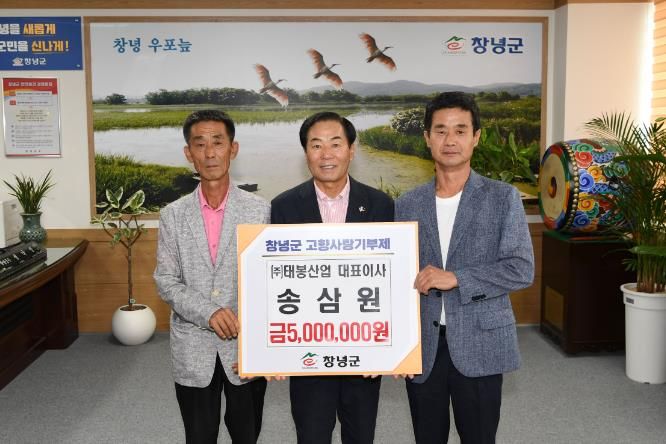 (아름다운교육신문) 창녕군은 지난 23일 ㈜태봉산업 송삼원 대표가 창녕군에 고향사랑기부금 연간 최대 기부 금액인 5백만 원을 기탁했다고 밝혔다.