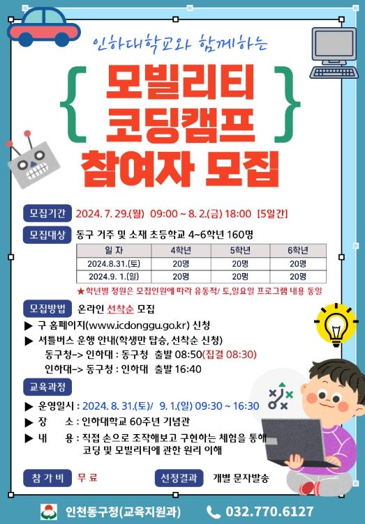 (아름다운교육신문) 인천 동구는 8월 31일 부터 9월 1일 인하대학교와 함께하는 ‘모빌리티 창의융합 코딩캠프’를 개최한다고 밝혔다.