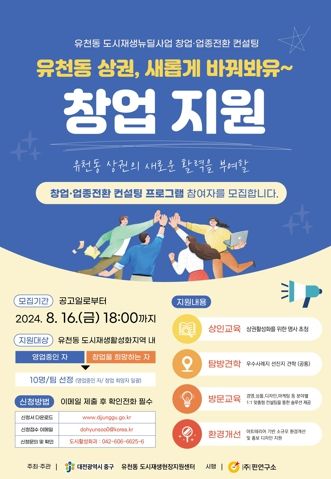 (아름다운교육신문) 대전 중구는 유천동 도시재생 뉴딜사업의 일환으로 ‘창업·업종 전환 컨설팅(2차)’ 참여자(10명)를 오는 8월 16일까지 모집한다고 밝혔다.