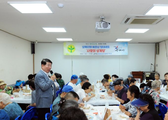 이날 행사를 위해 교문1동 새마을 남·여 회원들은 직접 손질하고 끓인 보양삼계탕과 오이소박이, 떡, 수박 등을 준비해 어르신들에게 대접했다.