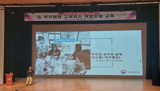 이번 교육은 인사혁신처 적극행정 전담강사로 활동 중인 울산광역시 울주군 공해열 주무관을 초빙해‘생각이 변하면 적극행정이 보인다’라는 주제로 구민의 눈높이에 맞춘 적극행정·규제혁신에 대한 노하우를 공유했다.