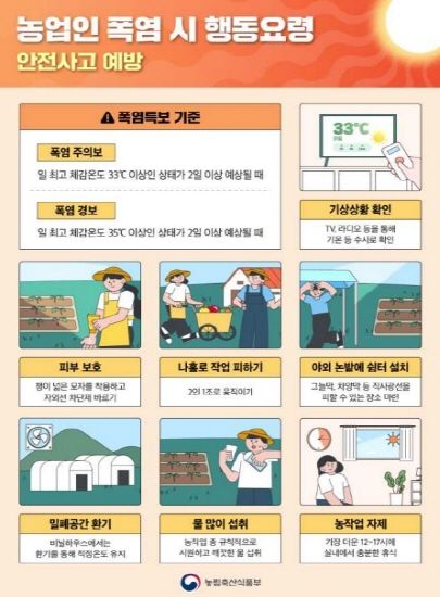 야외 논밭에서 농작업을 많이 하는 농업인 특성상 폭염으로 인한 안전사고에 취약하므로 더욱 각별한 주의가 필요하다. 지난해 농촌지역 논밭과 비닐하우스에서 폭염으로 인한 온열질환자가 443명, 사망자가 16명 발생했고, 이 중 80%(13명)는 장마철이 지난 후 본격적인 폭염이 시작되는 7월말에서 8월초에 집중됐다.
