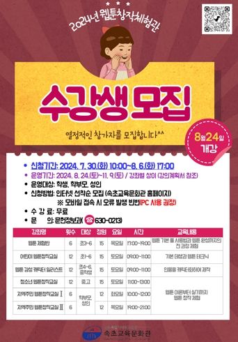 속초교육문화관 누리집에서 수강 신청이 가능하며 모집 기간은 7월 30일부터 8월 6일까지 선착순으로 모집한다.