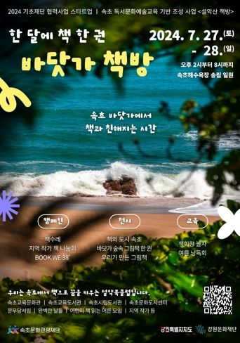 (아름다운교육신문) 강원특별자치도교육청속초교육문화관은 속초문화관광재단과 함께 독서와 자연을 사랑하는 이들에게 휴식과 영감을 제공하기 위해 7월 27일 속초해수욕장 송림 일원에서 ‘설악산 책방-바닷가 책방과 함께하는 책이랑 놀자~!’ 프로그램을 운영한다.