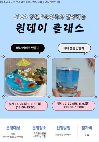 (아름다운교육신문) 명주교육도서관은 강원특별자치도교육청교직원수련원과 함께 7월 26일부터 8월 9일까지 투숙객 가족을 대상으로 수련원 2층 소회의실에서 ‘강원교육과 함께하는 원데이 클래스’를 운영한다.