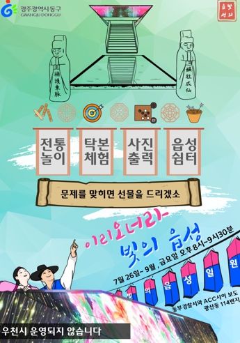 (아름다운교육신문) 광주 동구는 지난달 개관한 ‘빛의 읍성’에서 26일부터 오는 9월까지 매주 금요일(오후 8시부터 9시 30분까지·우천 시 미운영)마다 ‘이리 오너라, 빛의 읍성’ 행사를 연다고 밝혔다.
