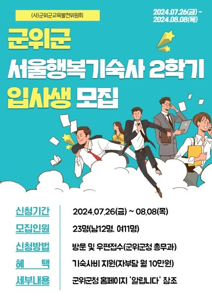 대구광역시 군위군 (사)군위군교육발전위원회와 한국사학진흥재단은 7월 26일~ 8월 8일까지 서울행복기숙사(서울 동소문동)의 입사생 모집을 진행한다고 밝혔다.