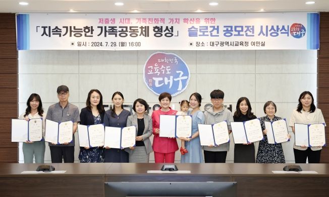 (아름다운교육신문) 대구시교육청은 7월 29일 오후 4시, 시교육청 여민실에서‘지속가능한 가족공동체 형성 슬로건 공모전’ 수상작에 대한 시상식을 개최한다고 밝혔다.