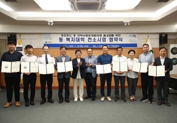 구는 지난 25일 구청 기획상황실에서 동 복지대학 컨소시엄 협약식을 개최했다. 구는 지역사회보장협의체와 주민센터, 구세군강북종합사회복지관 및 북서울종합사회복지관과 협약을 맺고, 교육 및 운영과 자문을 맡을 전문위원을 위촉했다.