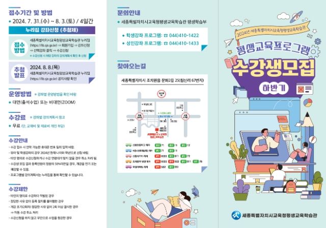(아름다운교육신문) 세종특별자치시교육청평생교육학습관은 7월 31일부터 8월 3일까지 ‘2024년 하반기 프로그램’ 수강생을 모집한다.