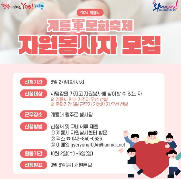 신청방법은 오는 8월 27일까지 계룡시 자원봉사센터에 방문하거나 팩스, 이메일로 신청서 및 구비서류를 제출하면 된다.