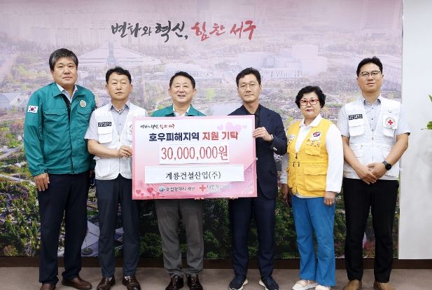(아름다운교육신문) 대전 서구는 지난 29일 계룡건설산업(회장 이승찬)으로부터 호우 피해를 본 서구 주민을 위한 수해복구 지원금 3,000만 원을 기탁받았다.
