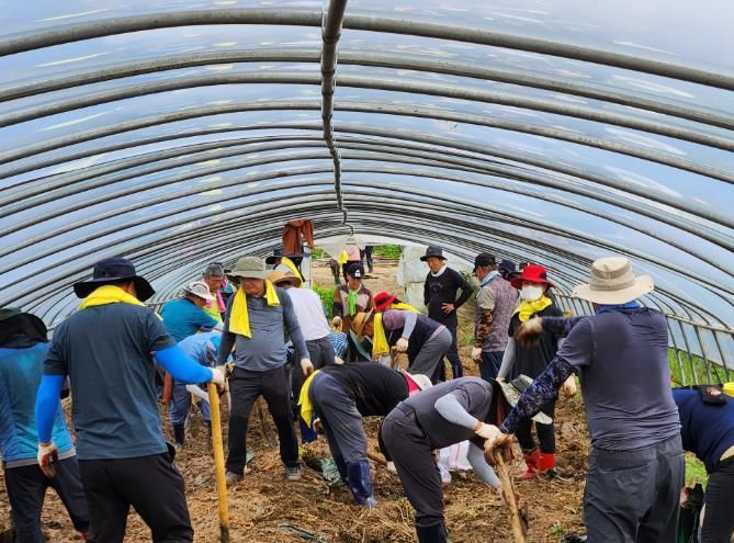 이날 연합회원 40여 명은 무더운 날씨 속에서 호우 피해 농가의 하우스 고추대 제거, 부자재 정리 등 복구 지원과 함께 응원과 격려의 말을 아끼지 않았다.