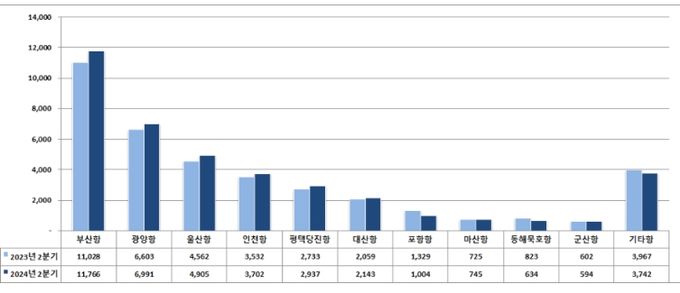 전국 항만의 2024년 2분기 비컨테이너 화물 물동량은 총 2억 5,071만 톤으로, 전년 동기(2억 4,958만 톤) 대비 0.5% 증가했다. 광양항, 울산항, 평택·당진항, 인천항 모두 증가했다.