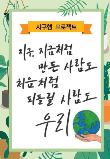 (아름다운교육신문) 대전서부교육지원청은 7월 30일,'지구행(지구를 구하는 한 가지 행동) 프로젝트' 콘텐츠 공모전 결과(사진 6편, 실천수기 6편, 표어(캘리그라피) 7편, UCC 6편)를 발표했다.