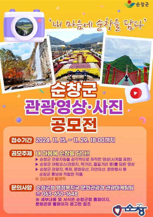 (아름다운교육신문) 순창군이 지역의 아름다움과 특색을 널리 알리기 위해‘내 마음에 순창을 담다’라는 주제로 관광 영상·사진 공모전을 개최한다.
