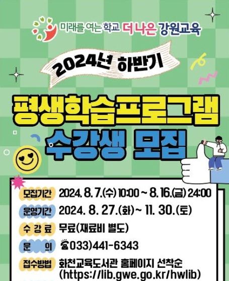 수강생 모집 기간은 8월 7일부터 8월 16일까지이며, 화천교육도서관 누리집을 통해 선착순 접수한다.