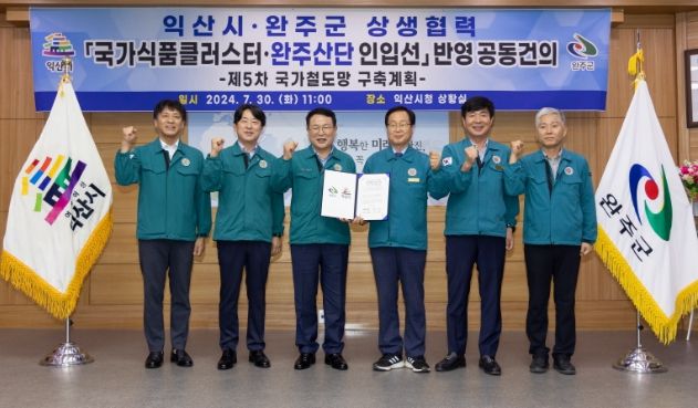 30일 익산시에 따르면 정헌율 익산시장과 유희태 완주군수는 익산시청 상황실에서 국가식품클러스터 인입선 사업의 제5차 국가철도망 구축계획(2026-2035) 신규사업 반영을 요청하는 공동건의문에 서명했다.