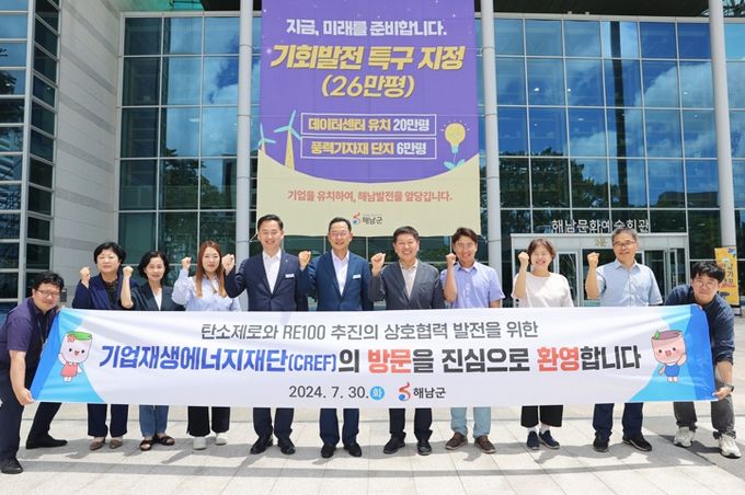 (아름다운교육신문) 해남군은 30일 진우삼 한국 RE100위원회 위원장을 비롯해 기업재생에너지재단(CREF) 일행들을 맞아 솔라시도 RE100 데이터센터파크 현장 견학을 진행하고 재생에너지 시장 활성화를 위한 협력 방안을 논의했다.