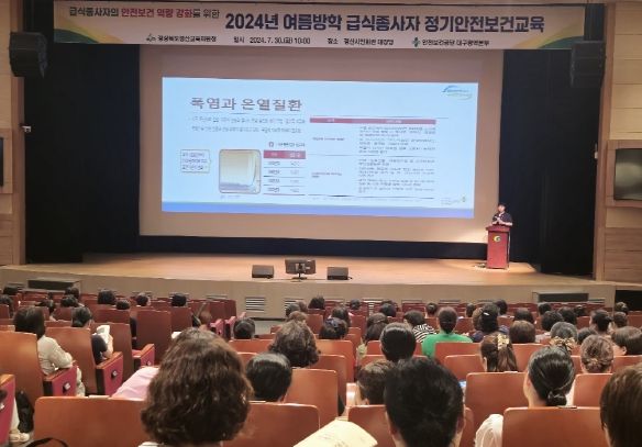 (아름다운교육신문) 경산교육지원청은 2024. 7. 30. 10시부터 경산시민회관 대강당에서 경산 관내 학교 급식종사자(조리사, 조리원) 260명을 대상으로 산업재해 예방과 안전보건 역량 강화를 위한 ‘2024년도 여름방학 급식종사자 정기 안전보건교육’을 실시했다.