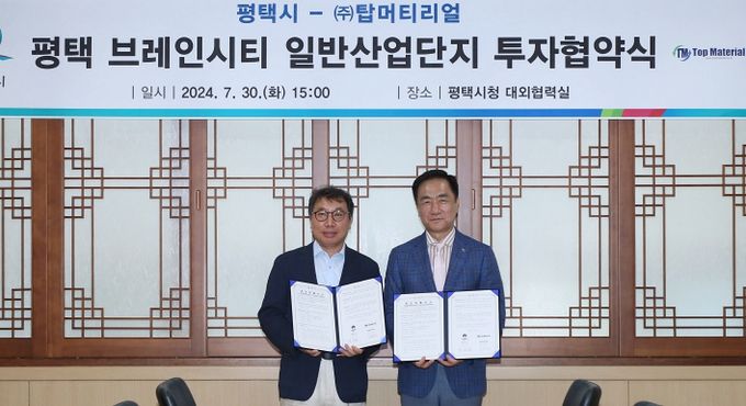 (아름다운교육신문) 평택시는 이차전지 소재 부품 제조기업인 ㈜탑머티리얼(대표 노환진)과 500억원 규모의 투자협약을 30일 체결했다고 밝혔다.