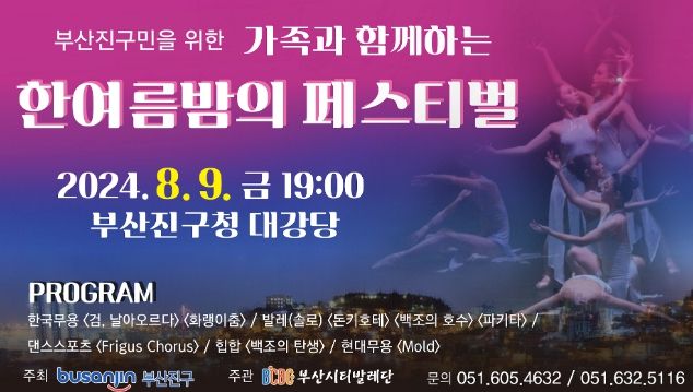 나이 제한 없이 모두가 즐길 수 있는 ‘가족과 함께하는 한여름밤의 페스티벌’은 70분 동안, 발레를 중심으로 한국무용·댄스스포츠·힙합 등 12개의 다양한 프로그램으로 이루어져있다.