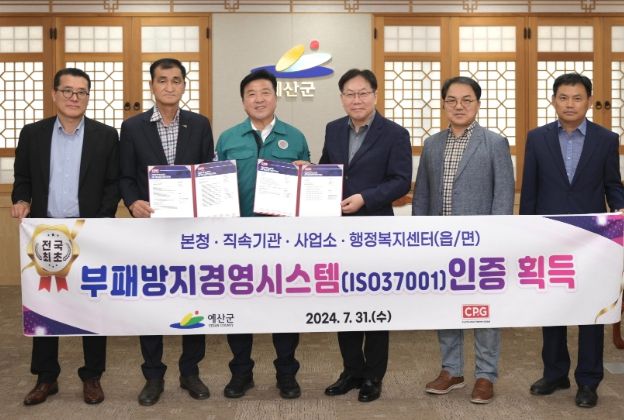 (아름다운교육신문) 예산군은 글로벌인증기관(JAS-ANZ호주등록)인 CPG인증원으로부터 군 전 부서(본청, 직속기관, 사업소 및 읍면행정복지센터)를 대상으로 약 2주간의 심사를 진행한 결과 부패방지경영시스템(ISO 37001) 인증을 획득했다고 밝혔다.
